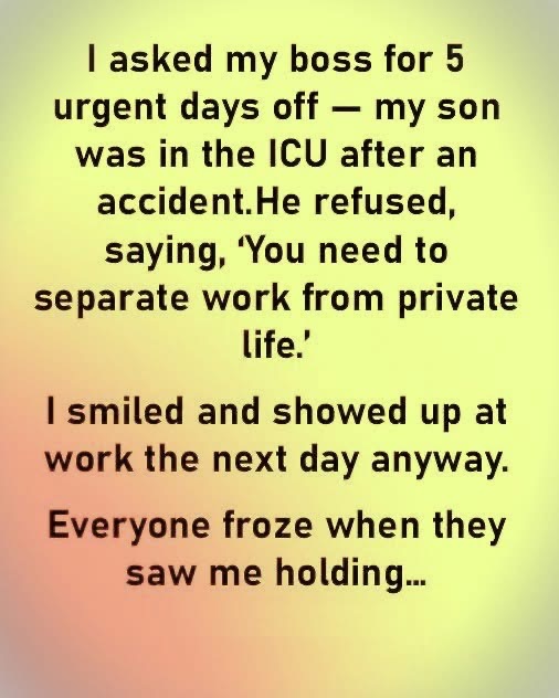 I asked my boss for five urgent days off after my son was hospitalized in the ICU following an accident. He refused, saying, “You need to separate work from private life.” I smiled—and came to work the next morning anyway. I walked in holding a small stack of folders labeled Emergency Transfer Proposal. My coworkers watched silently as I entered the conference room and placed them on the table in front of my boss.